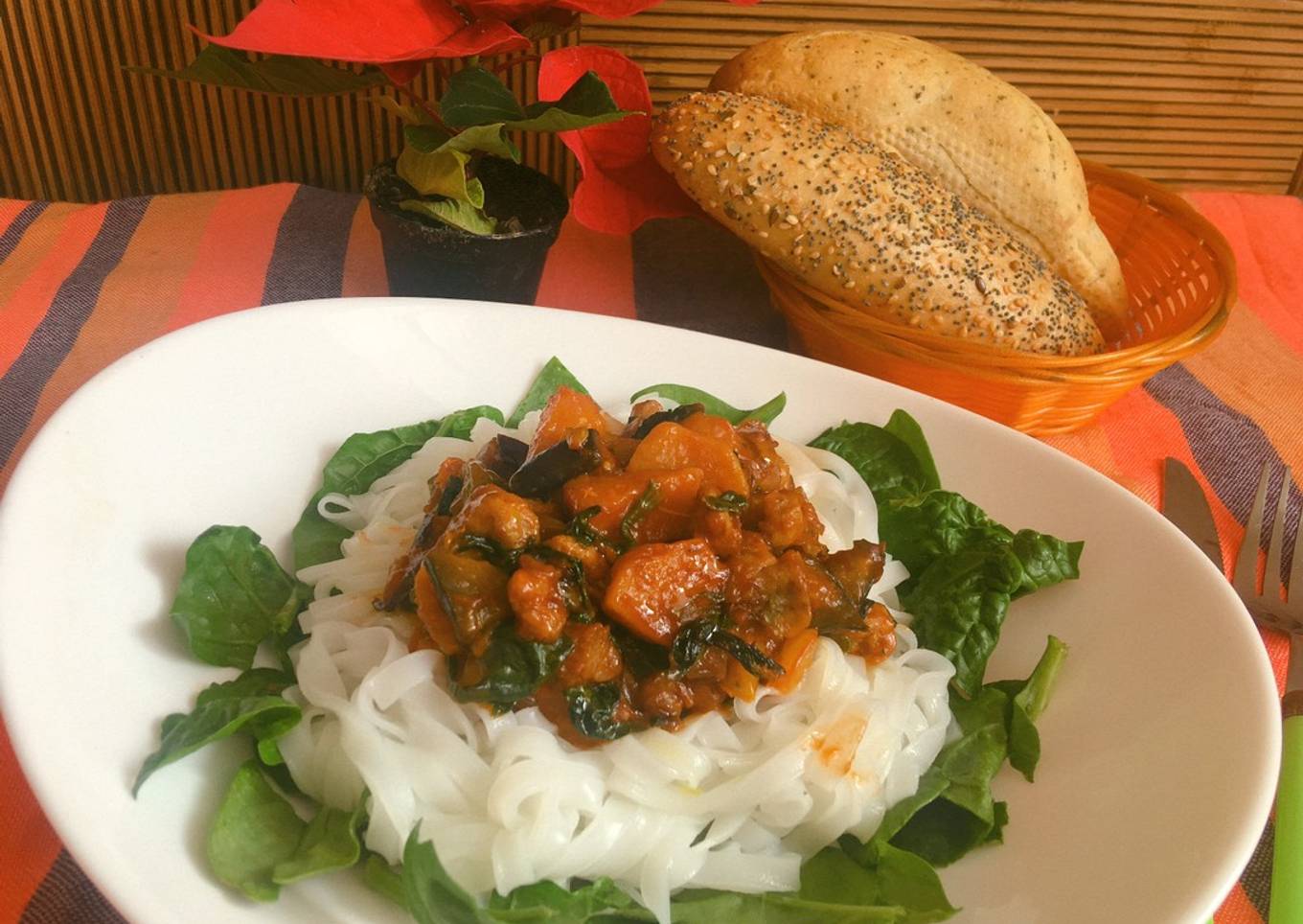 Tallarín de arroz con Soja y pisto de calabaza, berenjena y espinaca