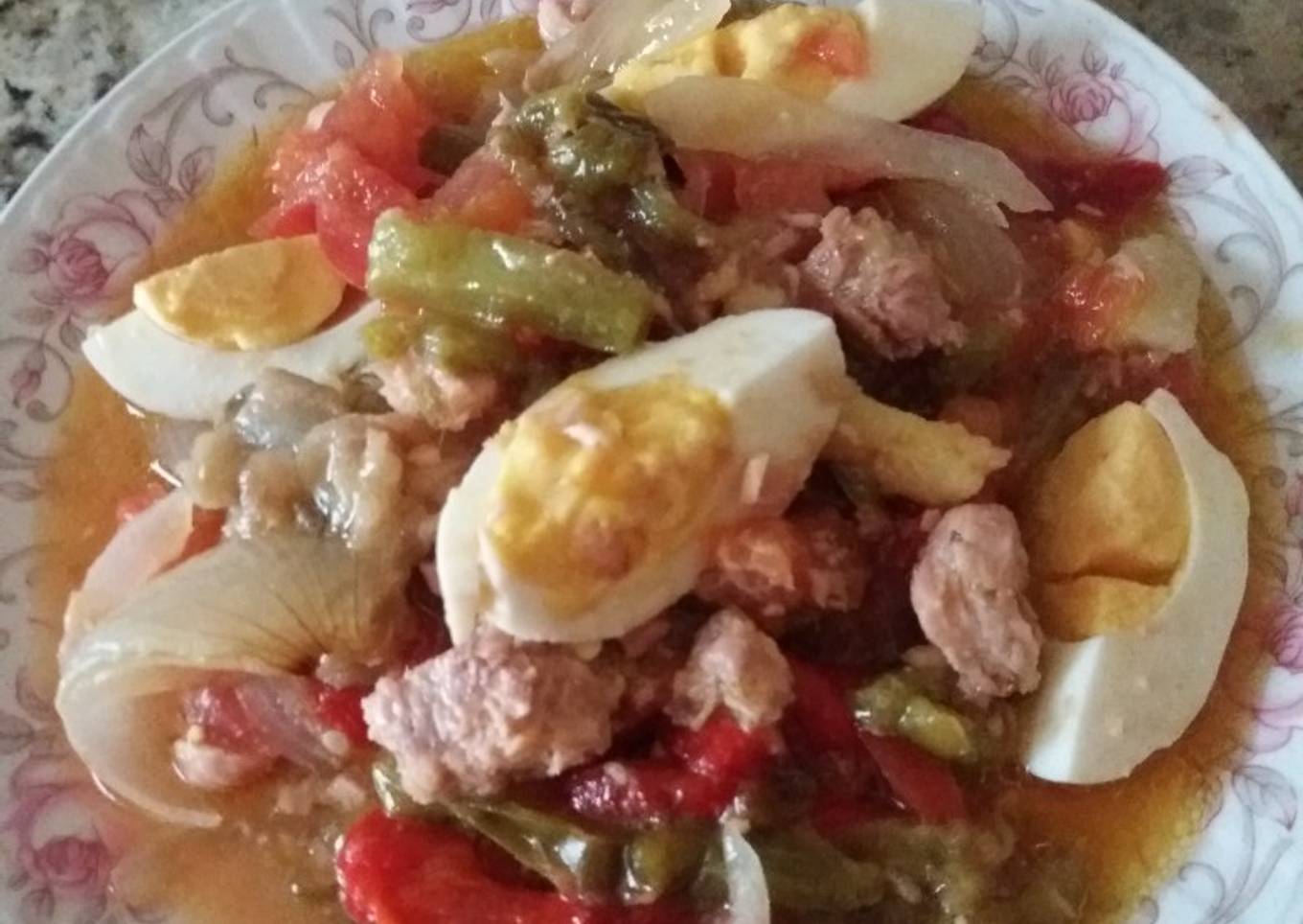 - Menos el tomate (foto)que se corta picado no mucho. Poner todas las verduras en un bol grande y añadir los huevos duros cortados en 4, echar un poco de sal (foto). Añadir el atún (foto).