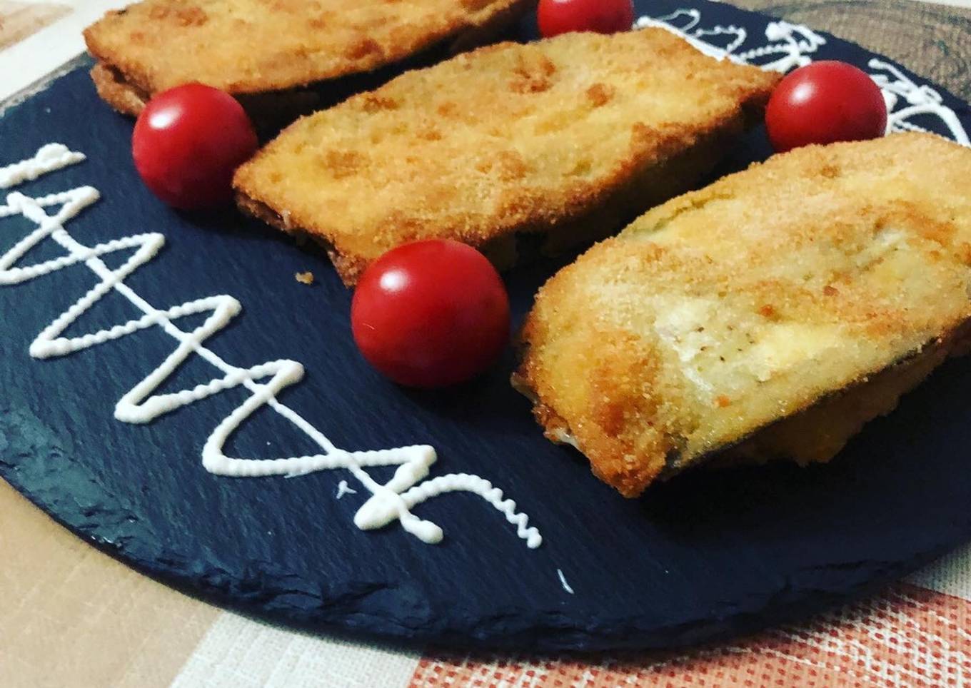 - En una sartén ponemos aceite de oliva virgen extra y freímos los libritos a fuego medio bajo para que la berenjena se haga bien, porque con fuego alto se quema el pan rallado y la berenjena queda cruda.